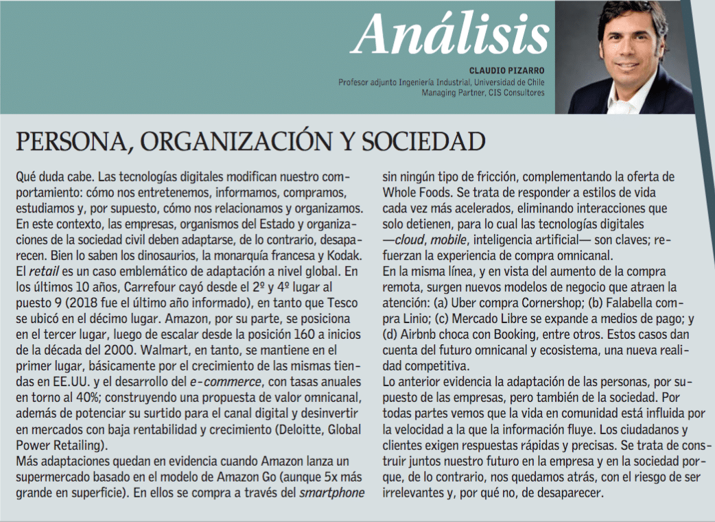 Continuando con su ciclo de columnas en Economía y Negocios de El Mercurio, nuestro Managing Partner, Claudio Pizarro, publicó la columna “Persona, organización y sociedad”; en la edición del 5 de marzo.