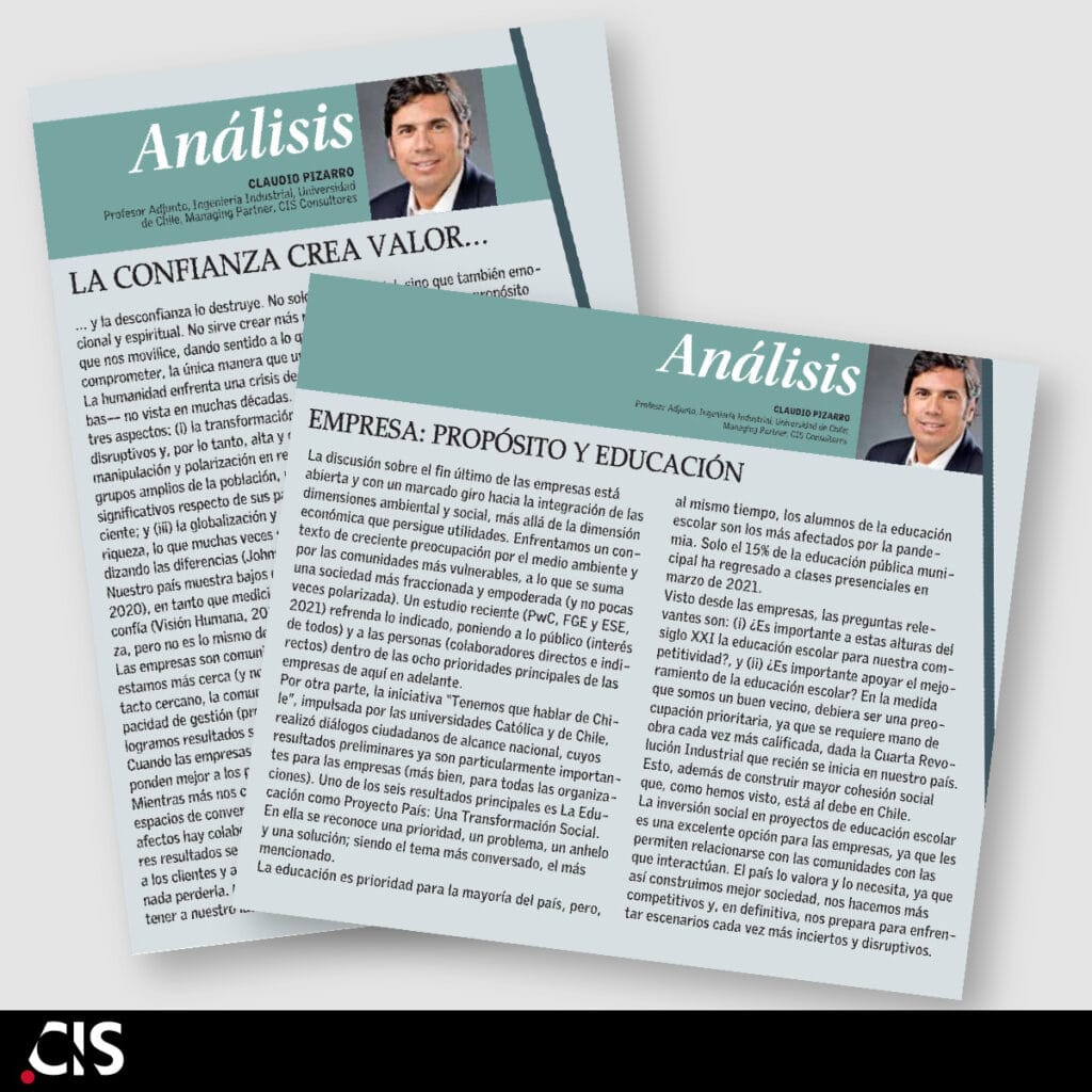 Compartimos las últimas dos columnas de nuestro Managing Partner, Claudio Pizarro, publicadas en El Mercurio. En ellas, nuestro Socio hace un llamado a reflexionar sobre la importancia de construir confianzas y comunidad, y también destaca el valor que la educación escolar tiene para la sociedad.