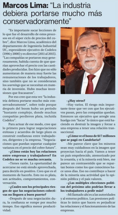 “La industria debiera portarse mucho más conservadoramente”, advierte Lima en el artículo “El lado complejo del alza del cobre para Codelco en 2021: Enfrenta 20 negociaciones colectivas”, junto con hacer un llamado a sacar lecciones de lo que fue el súper ciclo del precio del cobre.